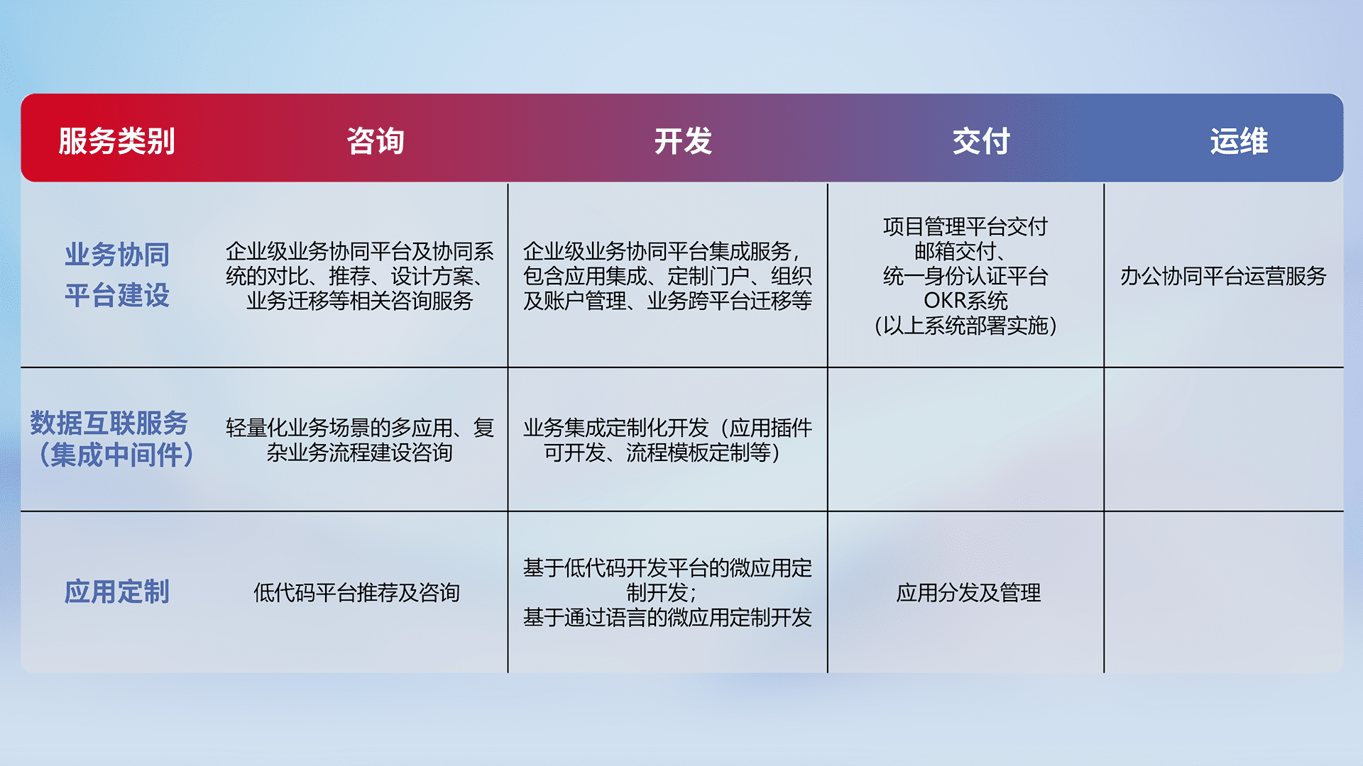 针对钉钉、、、、企微、、、、IDaas等平台级产品提供产品的规划、、方案、、、交付、、、定制化开发等服务,,,,实现如统一协同办公、、、智能客户服务、、、混合会议管理、、智能数据查询、、等业务场景,,实现数字化转型。。